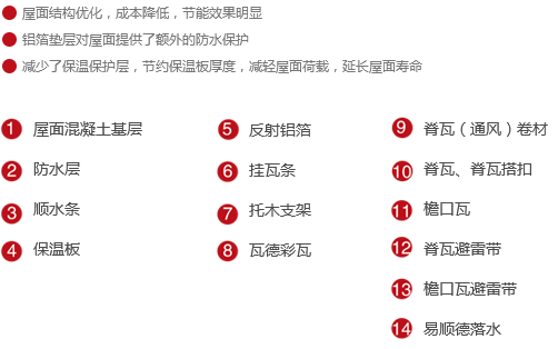 作為傳統屋面通風方案的優化,鋁箔墊層的加入,使反射鋁箔與嵌入順水條間的保溫板形成空氣間層,代替了部分保溫板厚度,而且省去了保溫保護層。